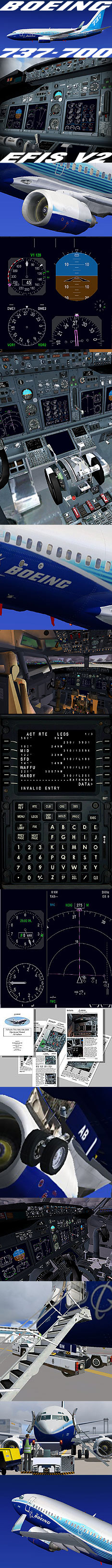 ********** EFIS DISPLAYS ******************* Introducing a new display interface - EFIS SYSTEM created to answer the needs of today's discerning simulation pilot. * ENGINE FITMENT PROGRAM. * New Higher-resolution, 32-bit texturing. * EDITABLE SELCAL CODE PANEL. * More accurate, DYNAMIC engine sets. * Payload station weight. * Uprated 600 Ng performance. * Autoflight climb/descent stability. * Improved 600 Ng thrust performance. * Enhanced readability on panels. * FDx performance curves. * Changes to Main Panel Sections * Revised Forward Overhead. * Aft Electronics Panels * Autopilot for 600 Ng MCP * Engine type Naming conventions! * Tutorial Guide * Install Guide & Quick Start * Normal Procedures * Flight Guide * Front End splash screen. * Illustrated FS LOAD section * AIRCRAFT Boeing background. * Enhanced Overhead Textures: * Trim Air layouts. * New AIR conditioning panel. * Lighting features. * Enhanced lighting. * DOME LIGHT effects. * 3d Concept Flight Deck * Ng AIRCRAFT DESIGN * Multi Channel Sound * Fluid, 3-part dynamic FDx * Flight Management System * IRS Inertial Reference System * MCP Master Control Panel System * Internal Aircraft Systems * Independent Lighting Systems * Advanced System Logic * Pushback trucks for 990 airports! * Ground Power Units! * Working Window De-icer System! * Rain Wiper Systems! * AI Contrails Set to Weather AI! * Multi-Monitor System! * Manage the galley in flight and prepare for take off and approach - manage stairs, doors and lighting systems as 'Number One'. Fly again using replay and view your flights from the jump seat or the Galley! Vectored displays. Pop-up windows. Fast frames per second! * EXTENSIVE REFERENCE - OVER 500 pages of manuals and documentation! * Reference & Information Manuals co-written by Boeing 737 Ng line pilots. * Complete NORMAL PROCEDURES included in the package! * EASY INSTALL file system - no editing required. Presenting the most advanced Flight Deck System for PC - with active controls - over 50 switches and systems - fully working interactive 3d environment with extensive reference set of manuals, tutorials, guides and information taking you through all stages of the flight process. *** PRODUCT SPECIFICATIONS *** - VCe Aircraft Version 2 - New EFIS panel systems - New Engine and Speed Management settings - New opening flight deck windows - New Dreamliner Scheme - New Flight COntrol Management panels - New Fuel Management - New FMC with advanced waypoint editing - New Logics and systems - New - New nose and main fuselage section - New cockpit interior texturing - Completely redesigned nose gear, doors and bays - New galley interior texturing - All 4 exit/service doors available - 2 cargo doors and bays - Animated RAM doors - Animated APU door - APU intake vortex generator - Emergency exterior lights - Wheel well lights - Animated ground power connection bay - Animated main outflow valve - Airstair bay with animated door - Animated windshield wipers - Correct aircraft static height on the ground - Aircraft.cfg to meet FS9 default payload manager - Textured red beacons and tail strobe device - Exit/service doors interior and animation - Glass transparency and glass textures - Dynamic shine on fuselage, vertical stab and engines - Nav lights illuminate the ground at night time - Galley FX ambient lights can be turned on/off by cabin light switch - Completely re-designed wingroot section - Animated wing contrails with weather condition definition - AIR and CFG FDX file dynamics VCe Flight Deck Version 2.3 - All common switches clickable and animated and all levers animated - Special control gauging to enable\disable VC's 3D objects/displays - Animated FWD EXIT galley and animated MAIN FWD EXIT doors. - Animated windshield wipers- modelled and animated - Rain glass effect - see ‘rain removed’ FX when wipers are on - 3D magnetic compass, modelled completely in 3D, no gauge used here. Don't miss the compass light switch under the base of the compass - Display Control System - Master caution System - Standby instrument knobs modelled in 3D - Hig Res - HiFPS - EZ Read texturing for main panels with shadows! - Fire Shutdown System - with added working fire handle - SAVE Seat Position System - Sliding window runners, seals & serial labels on side windows _ Map clipchart - Click zones over EFIS CP System - Clock modelled in 3D, with click zones - Nose steering tiller modelled and controllable in 3D - Packs switches clickable and animated - Night bitmaps - New autopilot logics and VC gauging and AIR files - Tooltips on door status lamps and many other places MCP/FMS/IRS Version 2 - MCP panel and FMC background lighting ambience - Background light for MCP and FMC - Editable background for CDUs from black to blue - ND & PFD inoperative pre-IRS coordinates entered into FMC System - New FMC VNAV profiles - SID\STAR support - Waypoint ALT and SPD restrictions - Smooth curved flight path on ND - MCP and EFIS control panels performance - More space for EFIS control click zones - Increased speed/VNAV holding stability - N1 calculation for TOGA and CLB as per Boeing performance tables - Take off N1 table for TOGA added to ini - Actual N1 calculation based on OAT/FMC TAKE OFF page - Climb N1 table added; calculation based on current altitude andCRUISE FL OAT - Take off speeds calculation based on TOW and FLAP POS FEATURES * Over 274 parts!!! * BOEING STYLE MANUAL * COMPLETE Flight Training Tutorial with Jepp Charts * NEW 32 BIT PAINT WORK OVER 267 LAYERS!!! * FASTER frame rates - dep on PC * (Hand-coded high detail compression) * Operating Airstairs with new lighting * Ng design; fuselage-to-wing authentic root * Five-part, real-time animation brake and roll spoilers * Detailed flap, hinges, pins and screws * New FDX fluid NEWTON LOGIC flight configuration * Lite Version Flight FDE * NEW format HTML electronic check lists and refs * Underwing detail/access ports and inlets * Over-wing light effects * Exit Lights, Logo Lights * New gear-ba