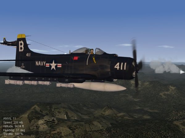 Throughout the late 1940s, more and more Navy carrier-based units were equipped with Skyraiders of various versions. As the year 1950 began, it appeared that the production of the Skyraider was going to be winding down quite shortly, with 12 Navy AD attack squadrons, plus two AD-4N night attack and two AD-3W early warning squadrons already in service. Throughout the Korean conflict, the Skyraider was used in a variety of roles--day and night attack against North Korean and Chinese troop concentrations as well as radar jamming and electronic countermeasures. It was able to carry a large variety of offensive loads, and was the only plane capable of delivering 2000-lb bombs with dive-bombing precision against targets such as mountain bridges and hydroelectric dams. Numerous sorties were flown by AD-4N night-attack aircraft. These three-seat aircraft were very effective in night operations, carrying a 500 lb bomb, 6 250 lb bombs and six flares.